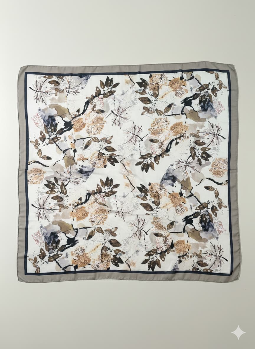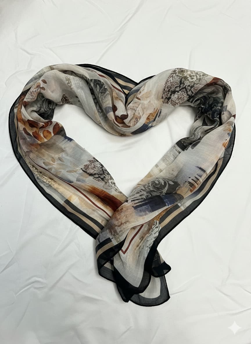 A chic and lightweight cotton voile scarf featuring an abstract black, white, and beige print, finished with a sophisticated cocoa border. This versatile accessory adds an artistic touch to any outfit.