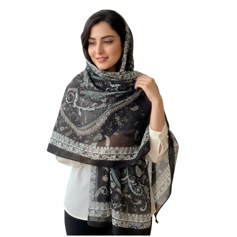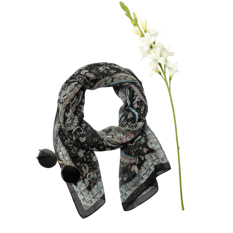Experience the perfect blend of traditional elegance and modern practicality with our Midnight Paisley Premium Cotton Voile Shawl. This generous rectangular scarf measures 177 x 68 cm (approx. 70 x 27 inches), offering versatile styling options from a full-coverage wrap to a chic layered look. The fabric is made from a premium cotton voile specifically chosen for its non-slip quality, providing a reliable grip that stays in place effortlessly. Decorated with sophisticated paisley and geometric motifs in subtle teal and earth tones against a deep black base, this breathable shawl is a timeless accessory for any season.