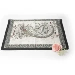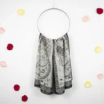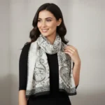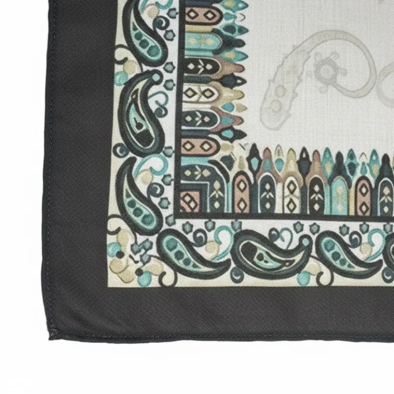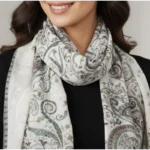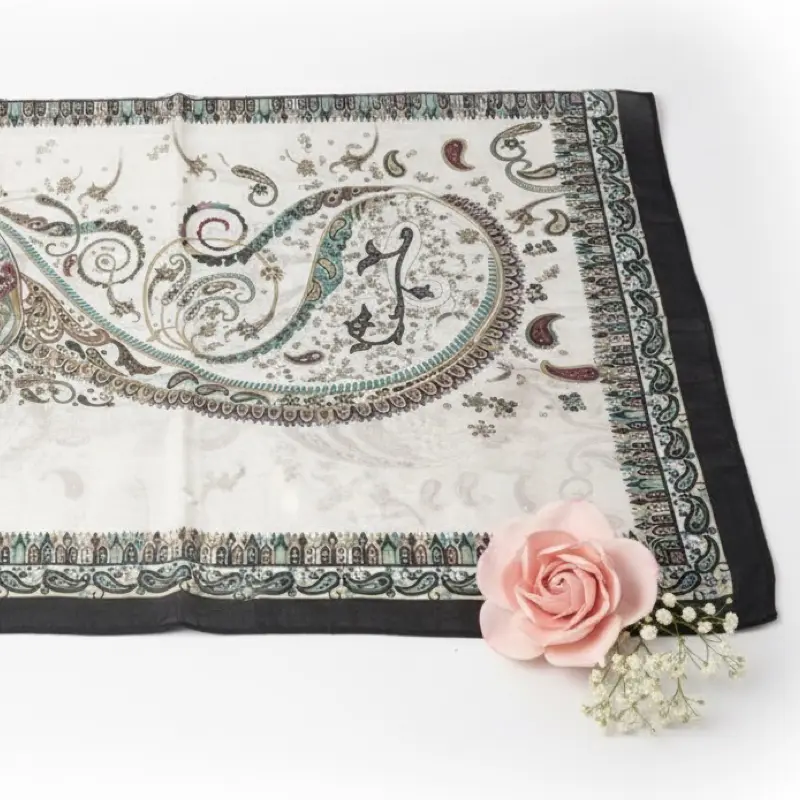 Add a layer of timeless sophistication with the Soft White & Black Paisley Wrap. This stunning accessory showcases an intricate, classic paisley pattern with subtle accents of muted colors like teal and burgundy, set against a luxurious soft ivory backdrop. The entire design is given a striking, modern contrast with a bold black border, framing the print beautifully.