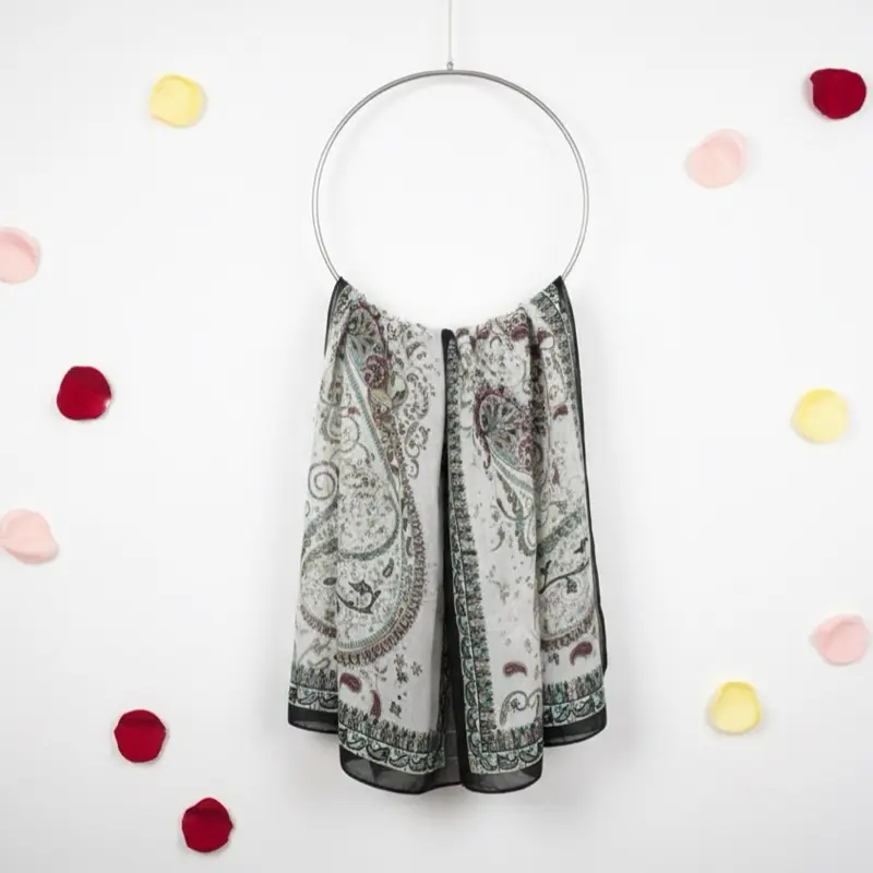 Soft White & Black Paisley Wrap. This elegant piece features a detailed, classic paisley design on a soft ivory white ground, beautifully highlighted by a chic, solid black border. Made from lightweight, breathable cotton voile, it drapes beautifully and adds a timeless, sophisticated touch to any outfit, making it a perfect year-round accessory.